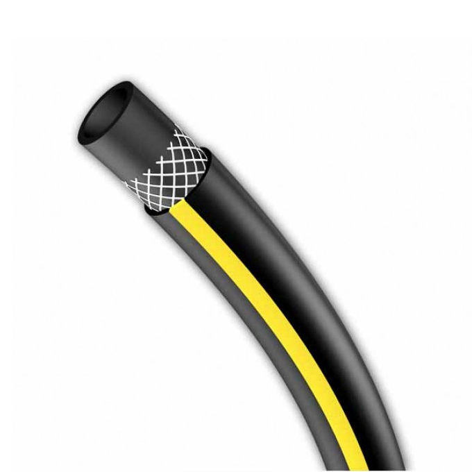 Цвет - черный с желтой полосой. Внутренний диаметр 1/2" (12,5мм) - подходит к штуцеру насосов "Ручеек". Рабочее давление 8 бар, этого достаточно для подключения к водопроводу или насосу. Нижний слой - черный ПВХ, верхний слой - черный ПВХ с желтой полосой, между ними сетчатая оплетка из полиэфирных нитей.