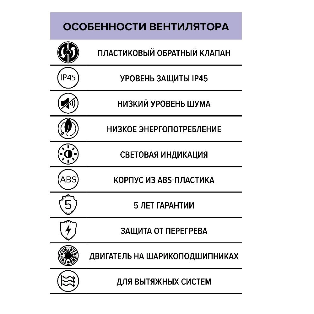 Вентилятор оснащен легкосъемной лицевой панелью, которая фиксируется с помощью защелки и надежно держится на корпусе; обратным клапаном для предотвращения попадания пыли и запахов из вентиляционного канала, индикацией работы в виде мягкой голубой подсветки.
