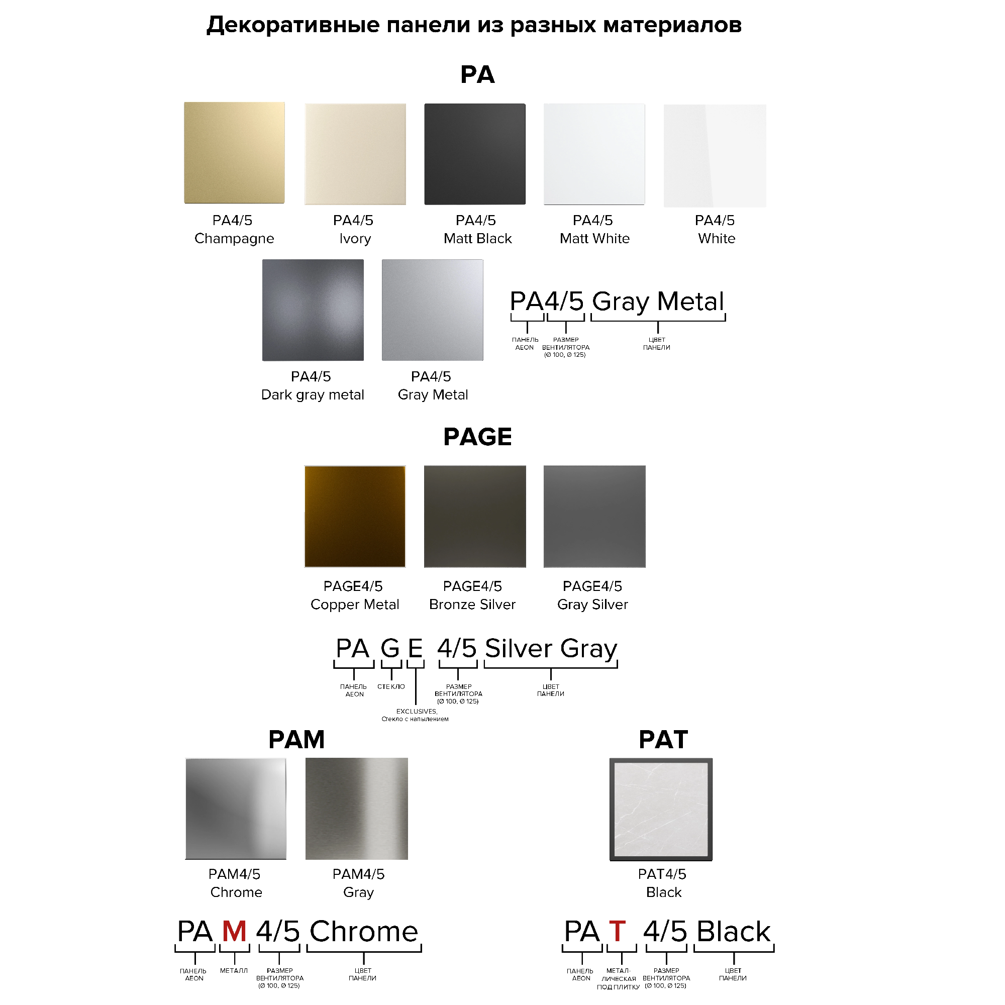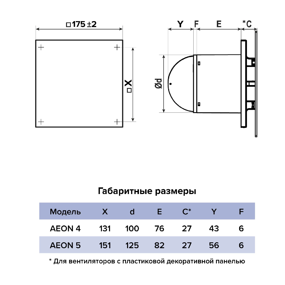 Декоративная панель из пластика подходит для всех моделей вентиляторов AEON. Стильная декоративная накладная панель позволяет интегрировать AEON в любой интерьер и обновлять его при желании, выбирая цвет панели из разнообразия вариантов. Для установки декоративной панели необходимо повернуть ее на 45°, затем прижать к лицевой панели вентилятора и еще раз повернуть на 45° по часовой стрелке. Таким образом декоративная панель будет надежно зафиксирована. В случае установки вентилятора в потолок необходимо закрепить лицевую панель снизу на корпусе саморезом (входит в комплект).