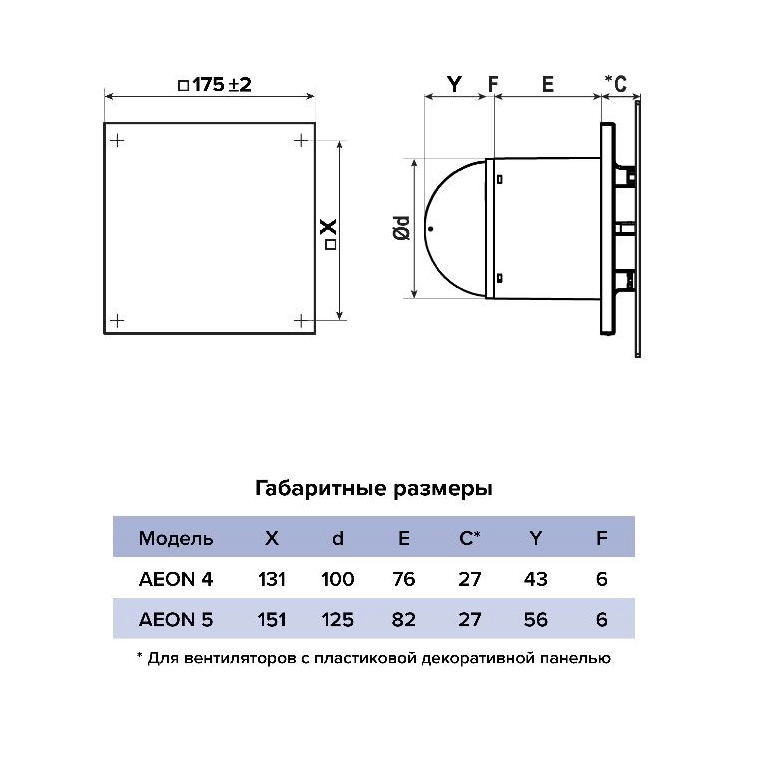 Декоративная панель из пластика подходит для всех моделей вентиляторов AEON. Стильная декоративная накладная панель позволяет интегрировать AEON в любой интерьер и обновлять его при желании, выбирая цвет панели из разнообразия вариантов. Для установки декоративной панели необходимо повернуть ее на 45°, затем прижать к лицевой панели вентилятора и еще раз повернуть на 45° по часовой стрелке. Таким образом декоративная панель будет надежно зафиксирована. В случае установки вентилятора в потолок необходимо закрепить лицевую панель снизу на корпусе саморезом (входит в комплект).