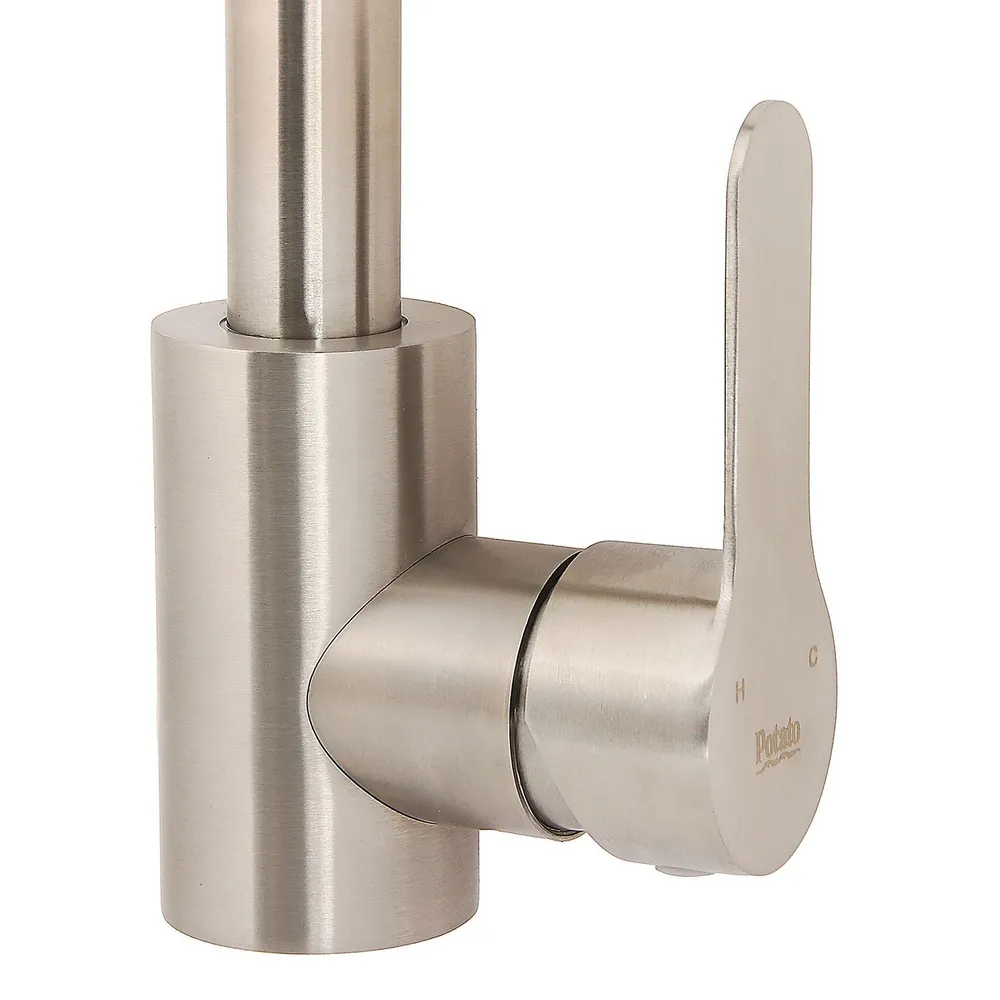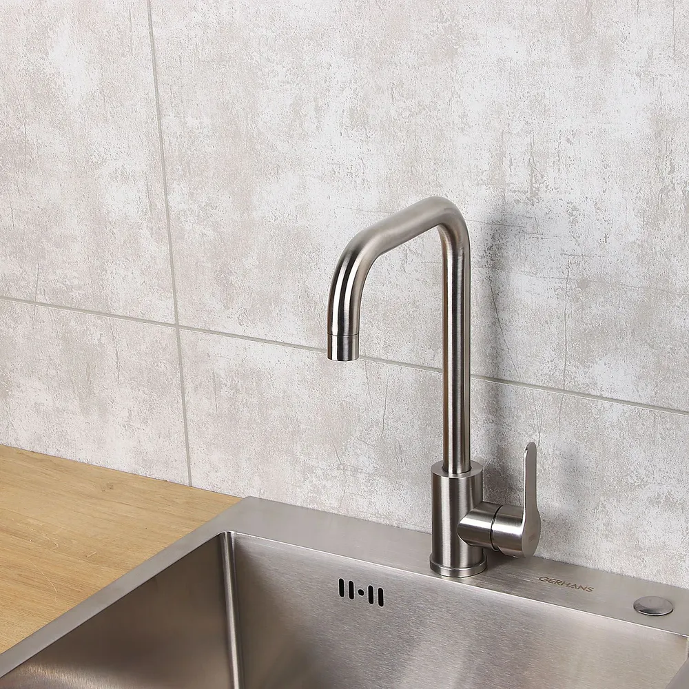 Смеситель для кухни с длинным изливом изготовлен из качественной нержавеющей стали.